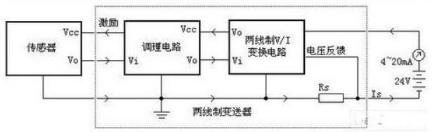 2021-09-17 06:40:47本文關鍵字:壓力傳送器 壓力傳送器主要由測量電路、過程連接件和測壓元件傳感器三部分組成。當壓力信號作用于傳感器時,壓力傳感器將壓力信號轉換成電信號,經差分放大和輸出放大器放大,然后經V/A電壓電流轉換成與被測介質的液位壓力成線性對應關系的4-20mA標準電流輸出信號。 壓力傳送器電路圖: 壓力變送器為什么要采用電流信號呢?因為采用電流信號的原因是不容易受干擾,常取2mA作為斷線報警值。并且電流源內阻無窮大,導線電阻串聯在回路中不影響精度,在普通雙絞線上可以傳輸數百米。下限沒有取0mA的原因是為了能檢測斷線:正常工作時不會低于4mA,當傳輸線因故障斷路,環路電流降為0;上限取20mA是因為防爆的要求,20mA的電流通斷引起的火花能量不足以引燃瓦斯。